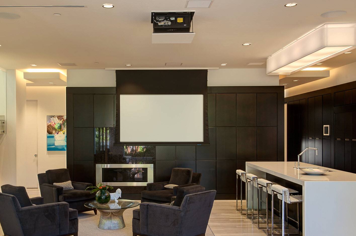 Смотрится совмещенный прием в помещениях в стиле хай-тек. При этом используется современная бытовая техника и материалы. В дизайне применяются прямые линии и монохроматическая цветовая палитра. Барная стойка оборудуется хромированными элементами и производится из инновационных материалов.