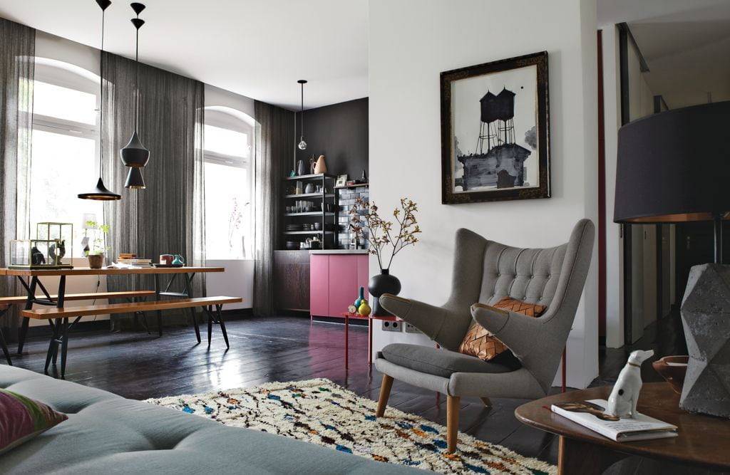 Отличительная черта такого дизайна в простоте, вовсе не обязательно для его реализации покупать дорогую мебель и отделочные материалы. Деревянный стол со стульями, причем они могут быть из разных комплектов, дешевая паркетная доска на полу и простой диван с мягким пледом в полной мере передадут вкус этого направления дизайна интерьера.