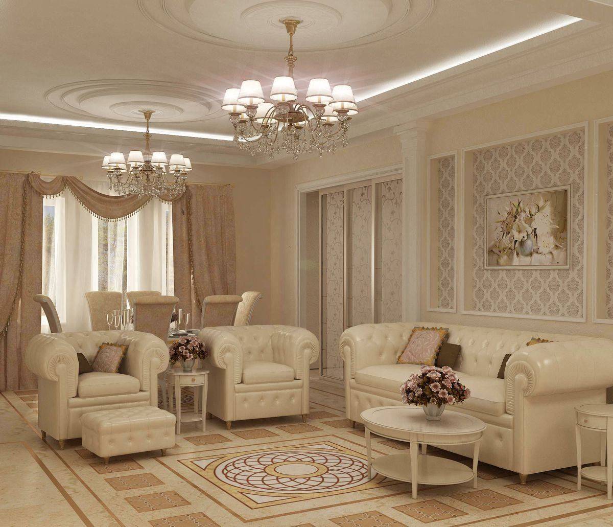 Цветовое решение классического интерьера предполагает достижение общей гармонии. Теплые пастельные оттенки выступают в качестве основных цветов. Это может быть бежевый, молочный, кремовый цвета. Потолок, колонны и камин оформляют белым цветом.
