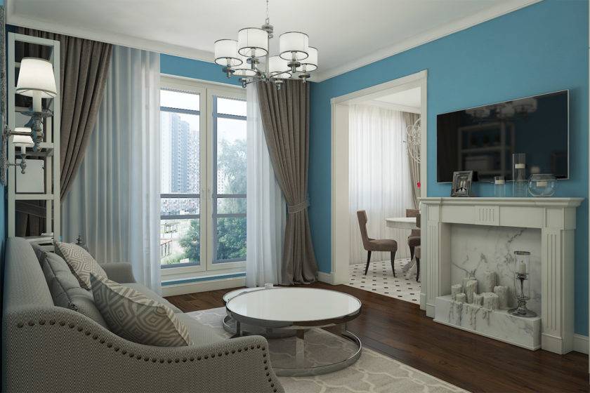 К такой базе обязательно потолок, все колонны и камин оформляются в белый. При этом стены выкрашиваются в какие-то насыщенные цвета. Это может быть темно-зеленый, песочный, коричневый, голубой, серый или розовый цвет. Есть и другие варианты, но главное, чтобы цвет не был слишком кричащим и выделяющимся на фоне базовой цветовой палитры.
