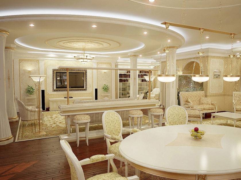 Важно чтобы полотно имело четкие геометрические формы или же имело имитацию росписи. Цветовая гамма – белый или кремовый цвета, создающие визуальное величие комнаты. При помощи лепных элементов можно произвести фрагментацию потолка, а на переходе между потолком и стенами располагаются лепные карнизы