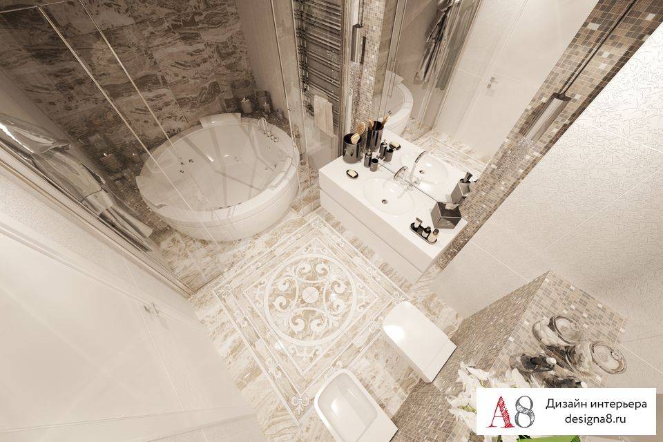 По желанию Заказчика в интерьер комнаты вписана большая круглая ванна, ограждённая стеклянной раздвижной шторкой. В этой зоне сделан оригинальный акцент — задний простенок оформлен с помощью напольной плитки под натуральный камень. Сзади чаши выполнена зашивка сливной трубы. С её помощью образовались полочки, которые вполне удобно использовать во время водных процедур.