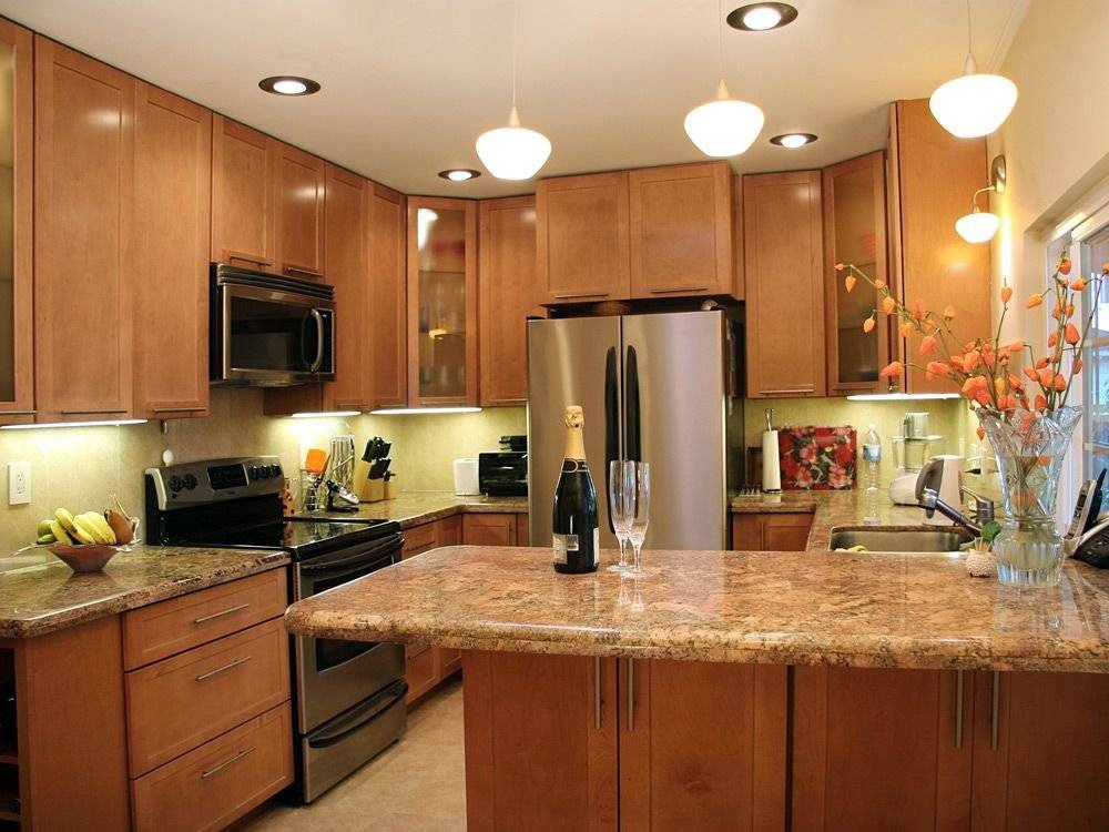 Отдельно необходимо создать освещение над рабочей зоной. В идеале – установить подсветку на нижнюю часть подвесных шкафчиков. Обеденная зона также требует дополнительного освещения. Здесь можно остановиться на настенном светильнике.