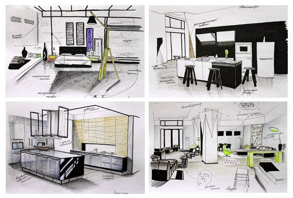Для составления этого этапа одного эскиза недостаточно, важно рассмотреть обстановку на этапе рисования со всех сторон. В эскизе должны быть обнародованы возможные варианты расстановки мебели, отделка поверхностей