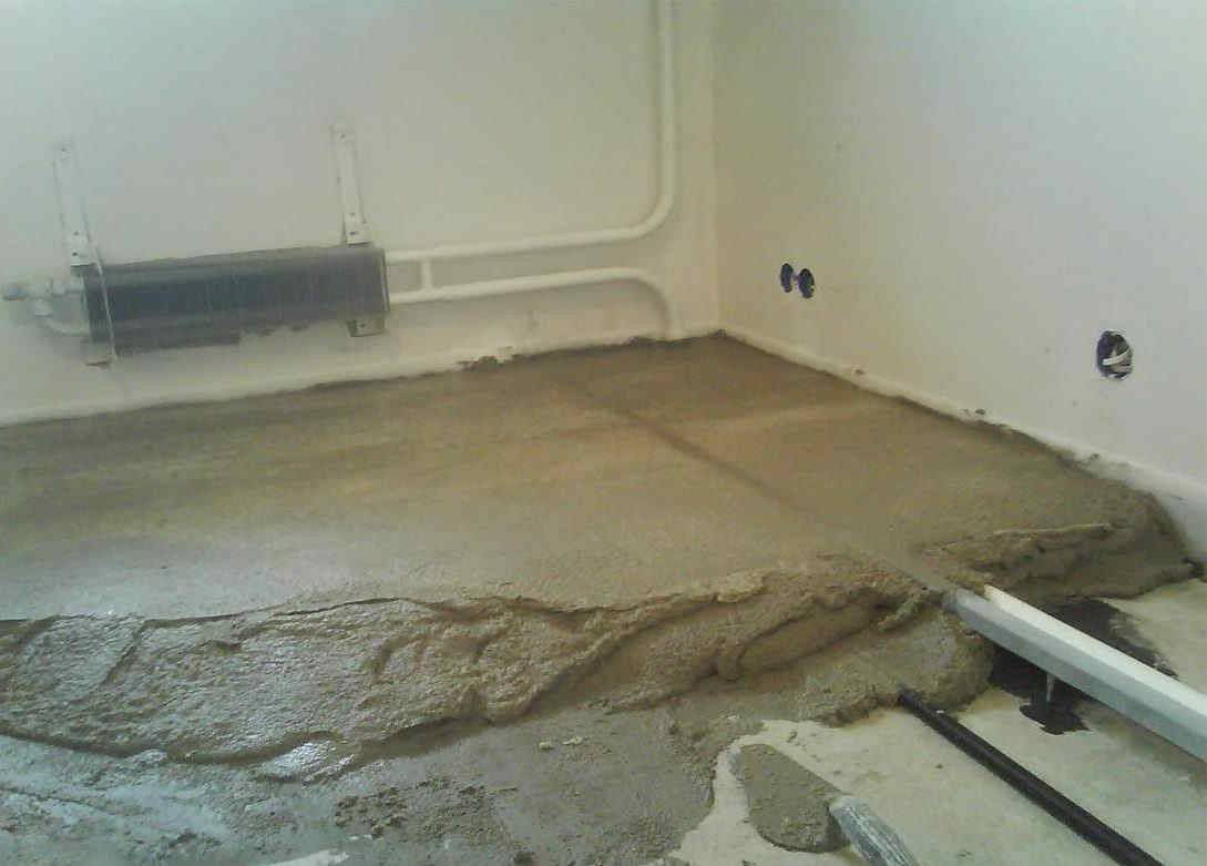 - Далее нужно выполнить цементную стяжку пола, если это требуется. Если пол достаточно ровный, без выбоин и трещин, то делать новую стяжку не нужно.