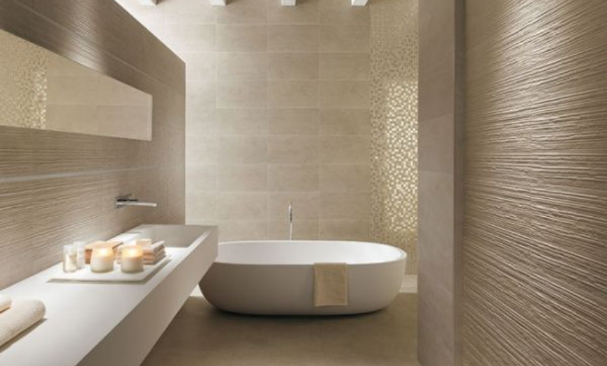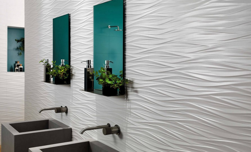 Среди новинок, предлагаемых рынком отделочных материалов, выделяется 3D плитка с объемной поверхностью. Можно подобрать крупноформатные скульптурные вариации с абстрактными или четкими геометрическими узорами.