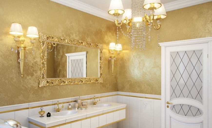 Для финишной отделки стен в условиях повышенной влажности применяется водоустойчивая штукатурка – силиконовая, полимерная, силикатная. Чаще встречается фактурная марокканская или венецианская отделка. Хорошо смотрится структурная штукатурка, например, покрытие «мокрый шелк».