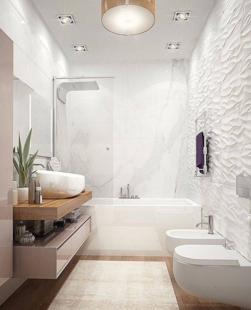 Например, можно установить ванну к стене напротив входа, с одной стороны зафиксировать подвесную мебель с мойкой. Возле ванны можно вмонтировать унитаз подвесного типа.