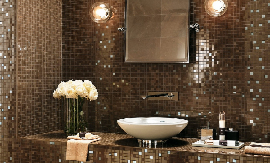 Выигрышно и стильно смотрятся стены, выложенные из мелких фрагментов. Мозаичные элементы хорошо сочетаются с разными фактурами. При желании создают мозаичные панно. Обеспечит долговечность венецианская мозаика. Может применяться смальта с матовым налетом, мрамор, камень, полимер.