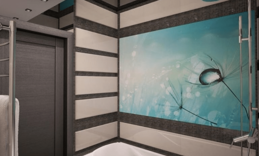 Необычный образ маленькому пространству придает отделка панелями, выполненными из закаленного стекла. Можно подобрать образцы с рисунком. Удивительный эффект придает подсветка. В этом варианте помещение приобретает перспективу.