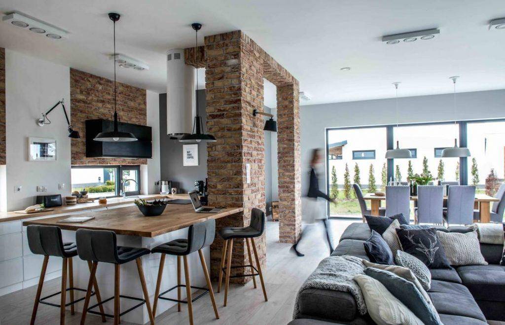 Часть стены с необработанной кирпичной кладкой привнесёт тепло в обстановку
