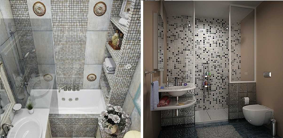 Плитка бывает с двумя типами поверхности — матовой и глянцевой. Глянцевая, за счет игры бликов, делает помещение более светлым и просторным, но может напоминать операционную. Помещение отделанное матовой плиткой или другими материалами выглядит более уютным. Также не выбирайте плитку большого размера. Средний или маленький в этом случае лучше, так как крупные фрагменты только подчеркнут небольшие габариты. В этом плане идеальна мозаика с блестящей поверхностью. За счет своей фактуры она очень хорошо смотрится.