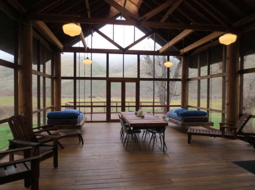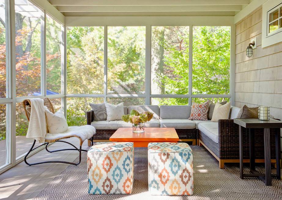 Если вас не радуют все традиционные стили, можно попробовать оформить веранду в современном. Из тех же материалов и мебели, но в другом сочетании и компоновке можно получить совсем другой интерьер. Например, опорные колонны можно сделать, как на фото ниже, расставить низкую современную мебель. Ограждение — того же стиля (как на фотографии), возможный вариант — из закаленного стекла или поликарбоната.