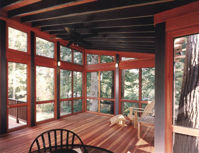 - Деревянная рама – классический вариант для остекления, особенно часто используемый в случае, если пристройка осуществляется к деревянному дому. Сделать такую раму можно своими руками или же заказать современный деревянный стеклопакет, который имеет большую цену и хорошее качество. Достоинства – экологически чистый, безопасный и натуральный материал, имеющий длительный срок службы и хорошую теплоизоляцию. Недостаток – плохая влагоустойчивость, материал нужно обрабатывать пропитками для избегания образования плесени и грибка.