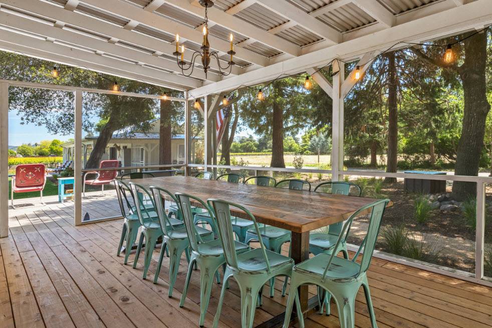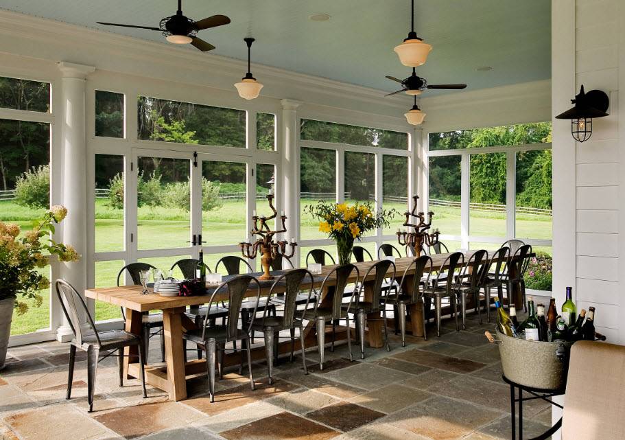 Часто монтируют светильники для веранды на стену дома. Это удобно: проводку тянуть далеко не нужно и проблем у установкой обычно не бывает. Чтобы сделать освещение более равномерным, несколько штук в том же стиле можно установить а колоннах или на потолке. В той зоне, которую нужно лучше осветить. На фотографии внизу это стол. Над ним в дополнении к настенным добавлены потолочные источники света.