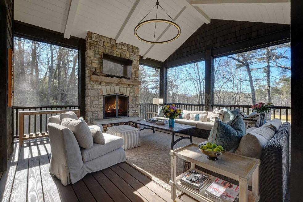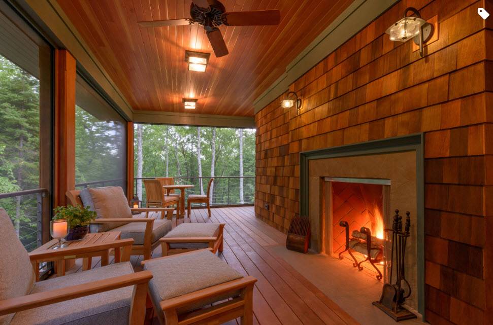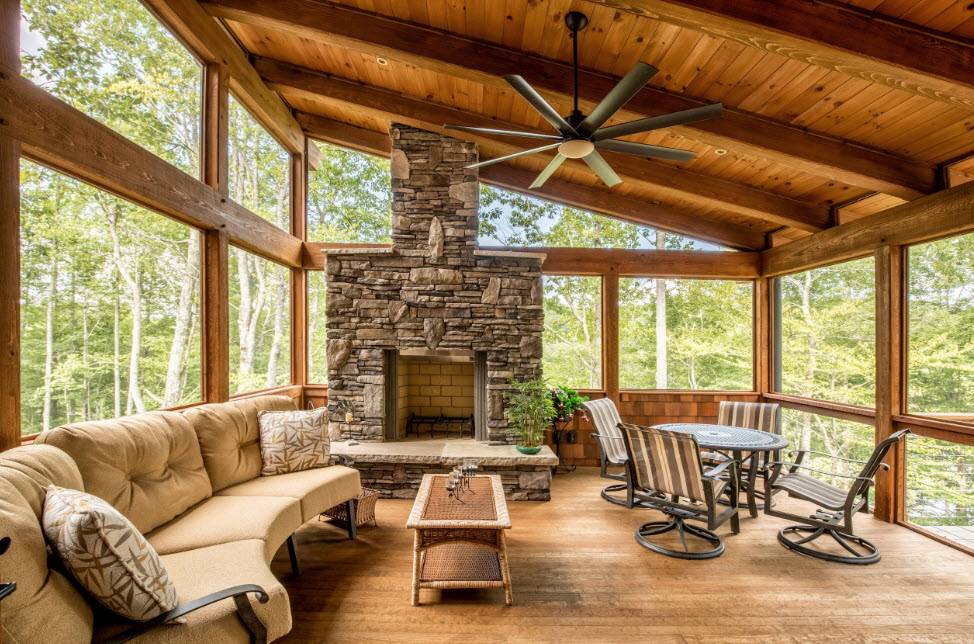 Если хотите полностью воссоздать такой интерьер, можно выложить камин. На закрытой веранде он послужит еще и для ее отопления. Его можно будет разжигать в сумерки в прохладные вечера. Создавая интерьер, не забывайте о единственной капитальной стене в этом помещении: отделка веранды включает в себя и ее оформление. Стену часто красят в преобладающий тон, иногда, если это уместно и вписывается в задумку, отделывают камнем.