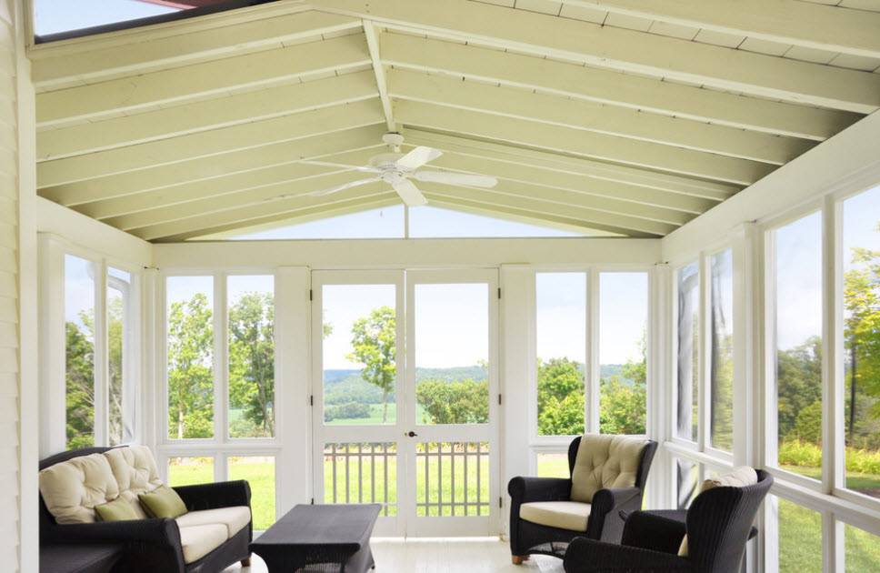 Если веранда направлена на юг или на восток, в ней будет много солнечного света. Такие помещения хорошо оформить в стиле «прованс». Для него характерны балки на потолке, натуральная мебель светлых тонов с некоторыми цветовыми акцентами. Занавески подбирают очень светлые полупрозрачные. Из мебели кроме стульев присутствует стол, могут быть цветы в горшках и вазах.