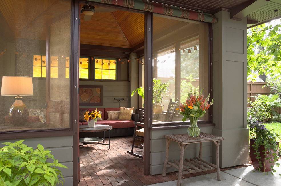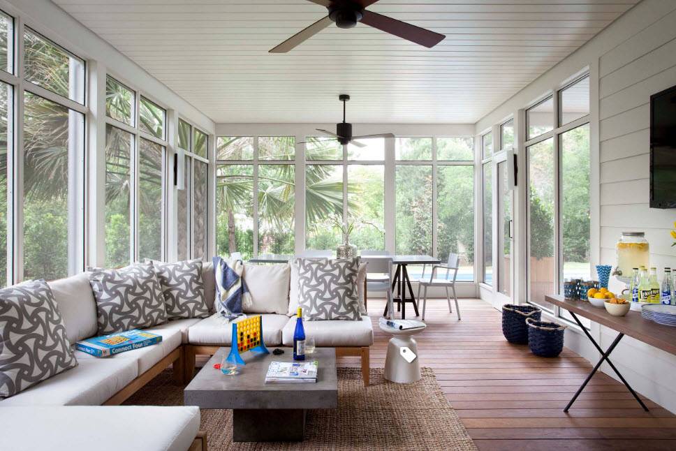 - для декорирования закрытых и застекленных веранд часто используют рулонные бамбуковые полотна или жалюзи, римские шторы. Особенно удобно, что можно вручную регулировать длину штор. Полотна, опущенные на всю высоту окна, надежно защитят помещения от солнечного света, что особенно актуально жаркими солнечными днями. Если веранда активно используется не только летом, целесообразно подобрать несколько комплектов штор для разных сезонов.