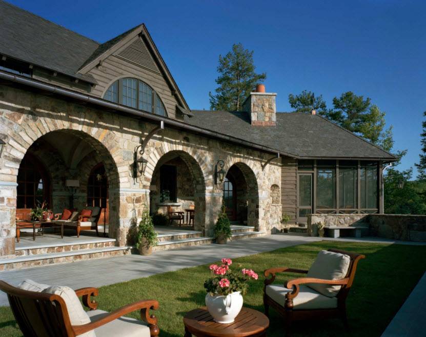 Практически такая же веранда обыграна по-другому: колонны одеты в камень, такая же отделка повторяется и на стенах дома.
