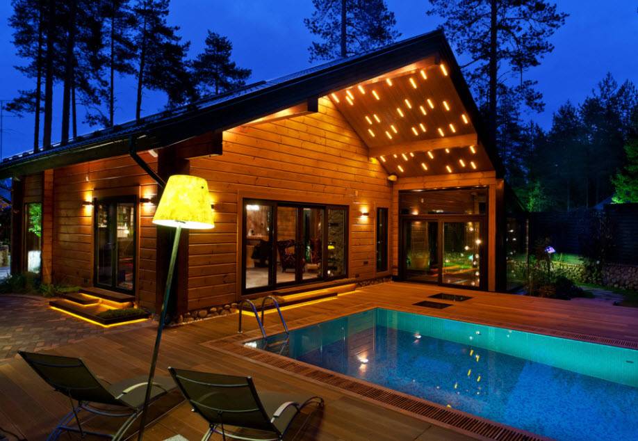 Хорошо освещенная веранда не только эффектно дополнит основное строение, но и красиво впишется в приусадебный участок. Открытые площадки оснащают «уличными» светильниками, имеющими повышенную защиту от воды. Лампочки закрепляют на перилах лестницы, по наружному контуру навеса.