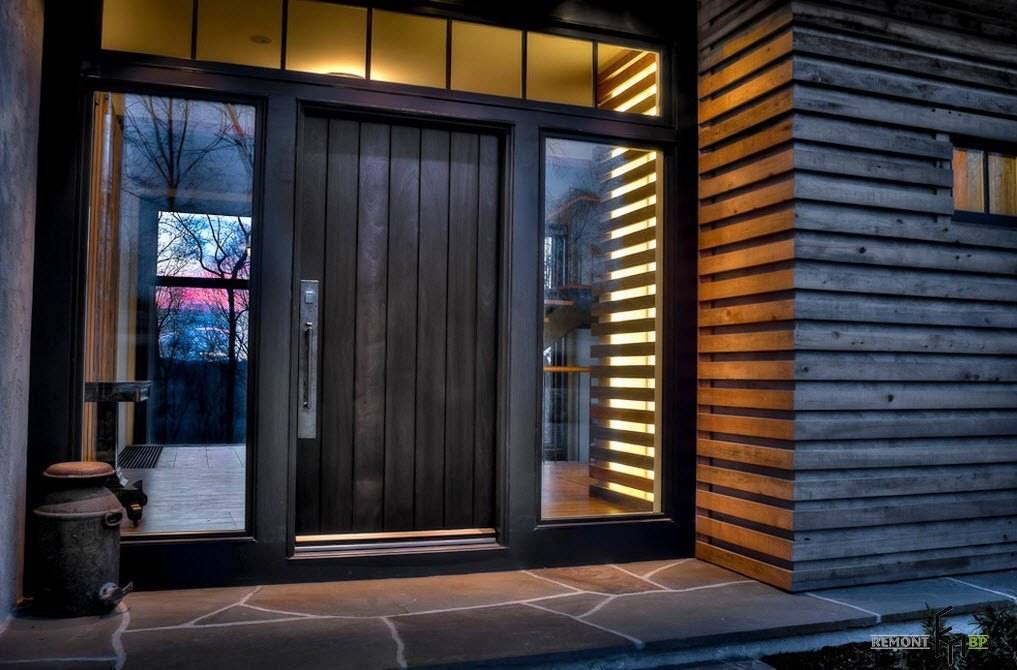 Оригинальная дверь из дерева со стеклянными вставками прозрачного и матового исполнения, стала изюминкой входа в здание частного дома, который не забудется никому из побывавших в нем.