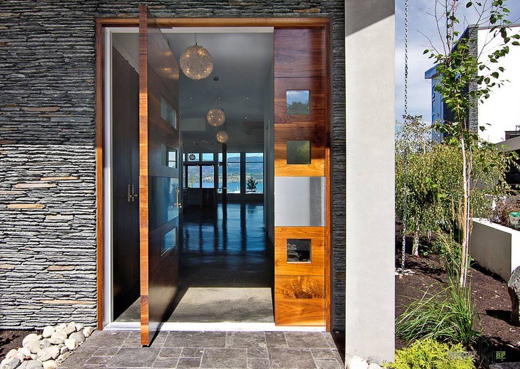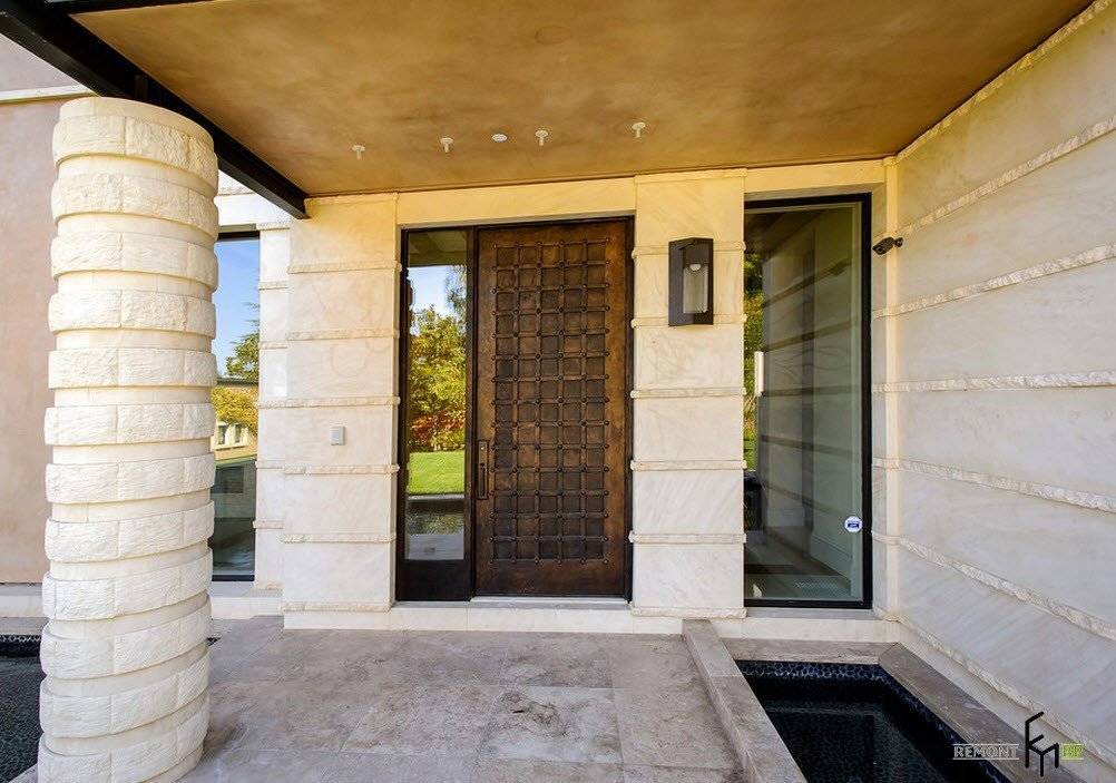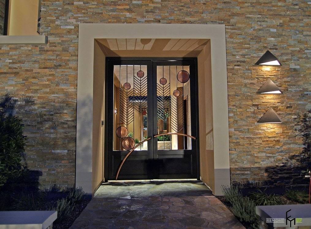 Двери необычного дизайна со стеклянными вставками и медными элементами способны стать визитной карточкой современного здания. На фоне каменной облицовки выигрышно смотрятся оригинальные настенные фонари для улицы в форме пирамид.