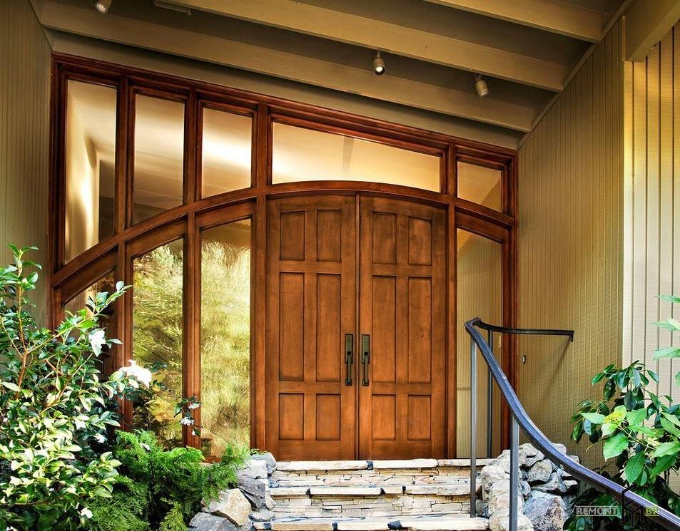 Подобные конструкции входной двери встречаются нечасто, но, безусловно, являются оригинальным способом не только разнообразить конструктивные особенности входа в помещение, но и возможностью оформления достаточно широкого дверного проема.