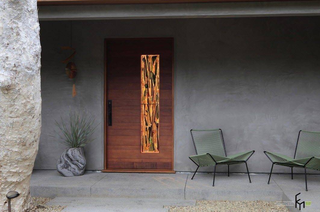 Для некоторых домовладельцев важно, чтобы не только внутри, но и снаружи их жилища все было просто и лаконично. Бетонная отделка стер и исполнение ступеней, оригинальная дверь, небольшое растение в каменной кадке и пара садовых кресел минималистского дизайна – строгий, но при этом интересный образ крыльца готов