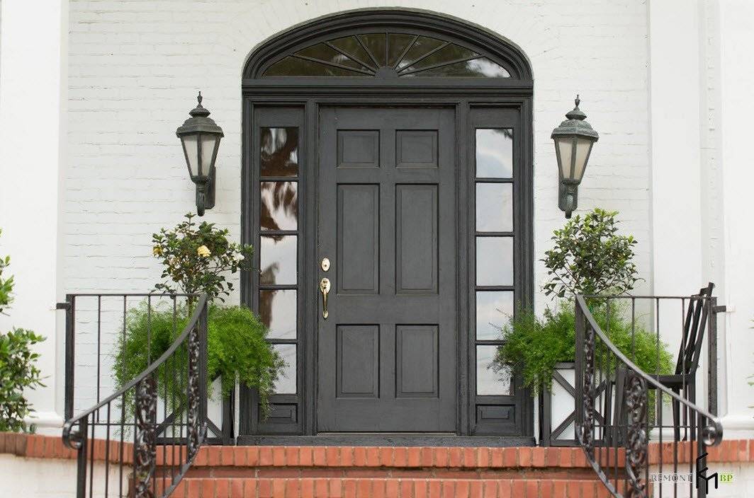 Арочный проем, стеклянные вставки на темном фоне дверного каркаса, кованые перила, уличные светильники, стилизованные под фонари – все способно украсить внешний вид здания в целом и крыльца в частности.
