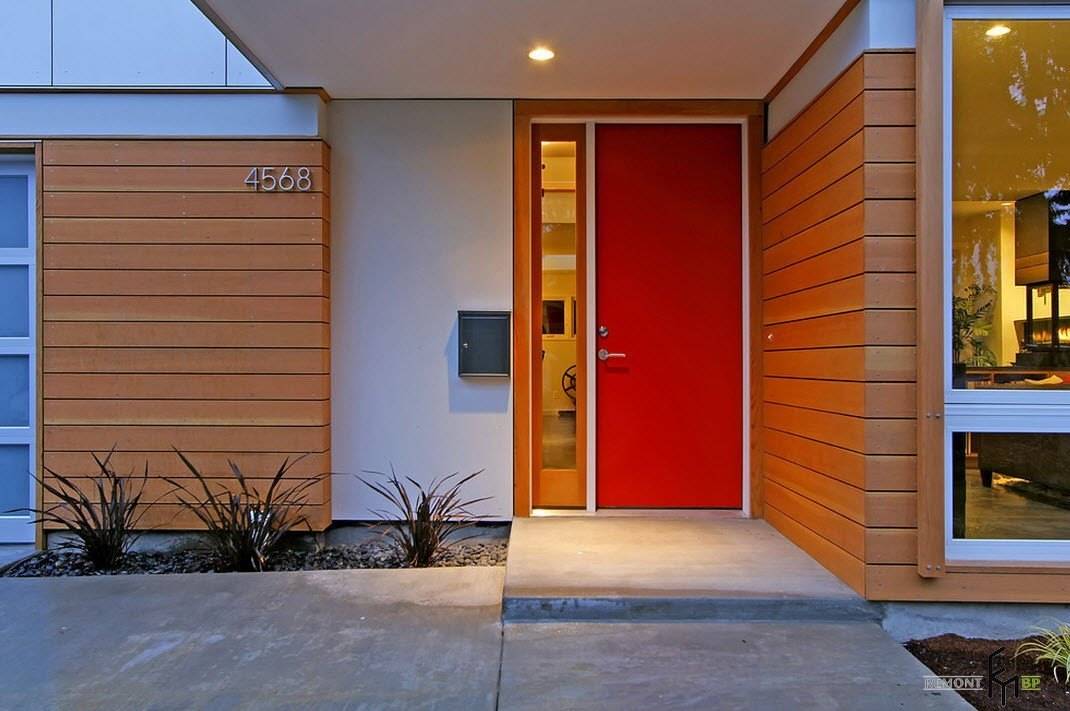 Часто экстерьер здания представляет собой практически однотонное и однообразное строение с минимумом декора, в таком случае на первый план выходит оформление главного входа и в частности – входной двери. Она может быть выполнена в необычном дизайне или просто представлена в яркой цветовой гамме