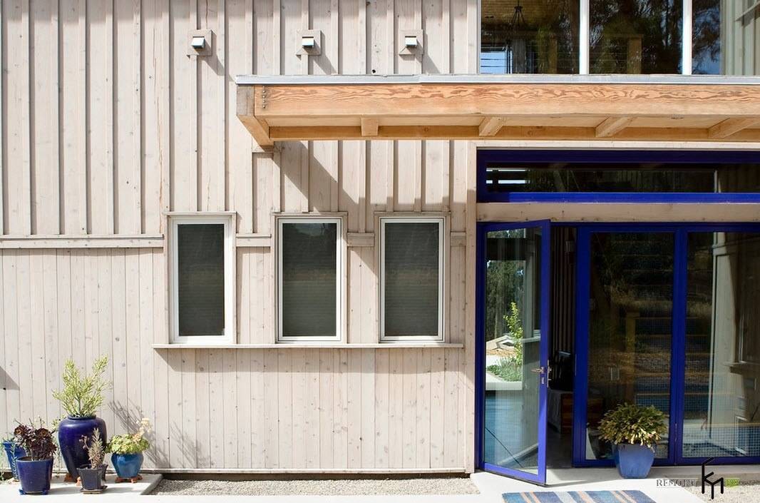 Насыщенный яркий цвет входной двери преображает спокойную отделку фасада здания. Небольшая стеклянная вставка возле двери позволит жильцам видеть посетителя изнутри помещения.