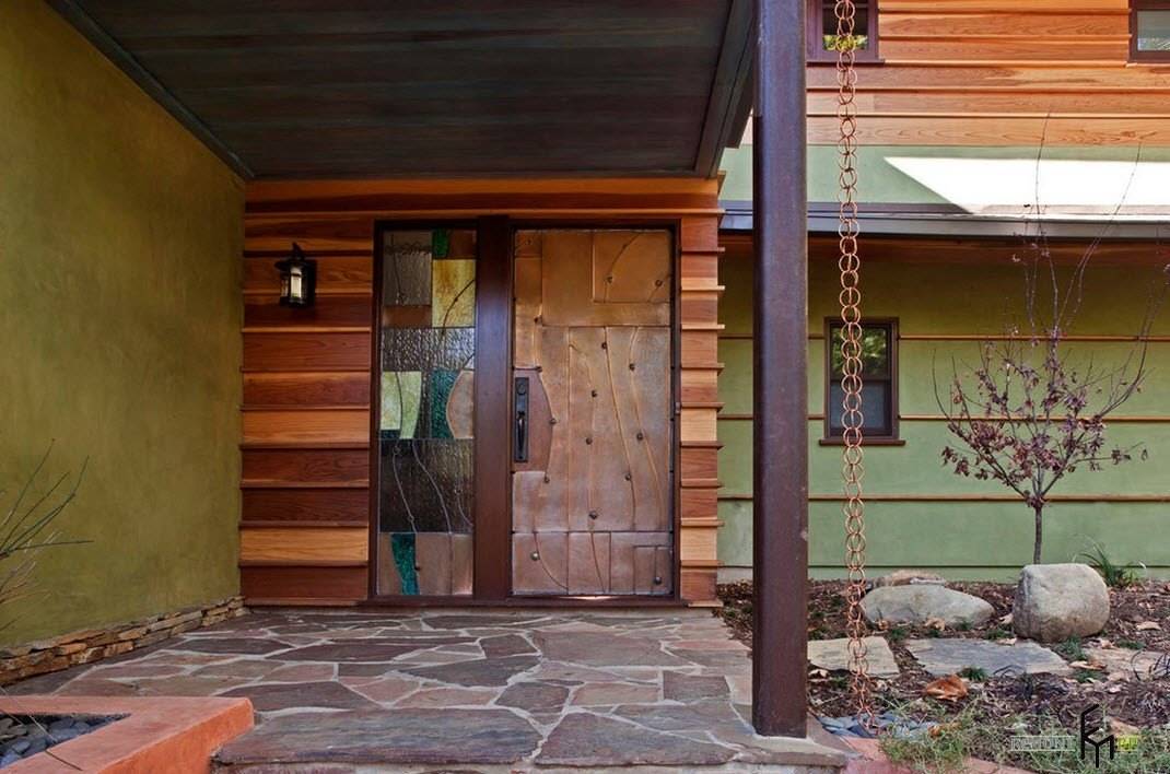 Дизайн этого крыльца частного дома нельзя назвать скучным, для его оформления были использованы разные породы древесины, камень-пластушка, витражное толстое стекло, окрашенное и рифленое, медные элементы и заклепки. Среди череды частных домовладений, подобный главный вход, безусловно, будет выделяться.