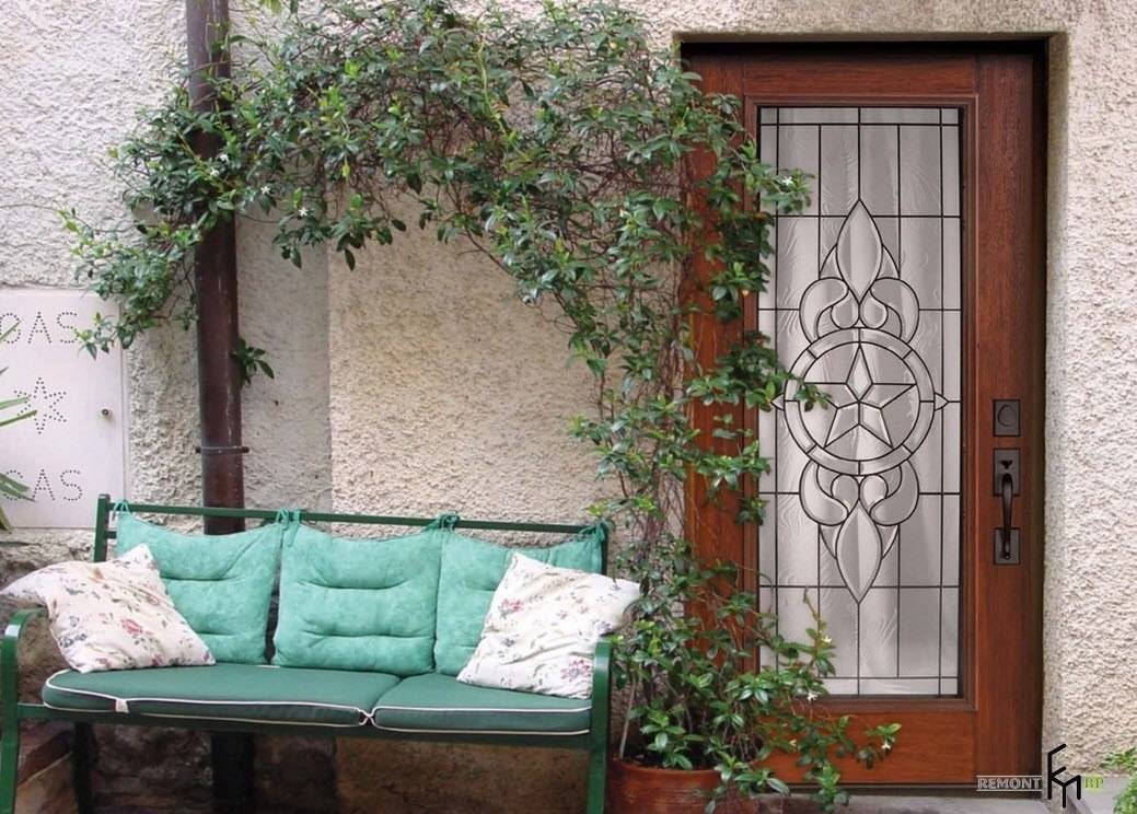Деревянная дверь со стеклянными витражными вставками, садовая скамья со съемными мягкими сидениями и вьющееся растение в уличном горшке составили оригинальную композицию на входе в частный дом.
