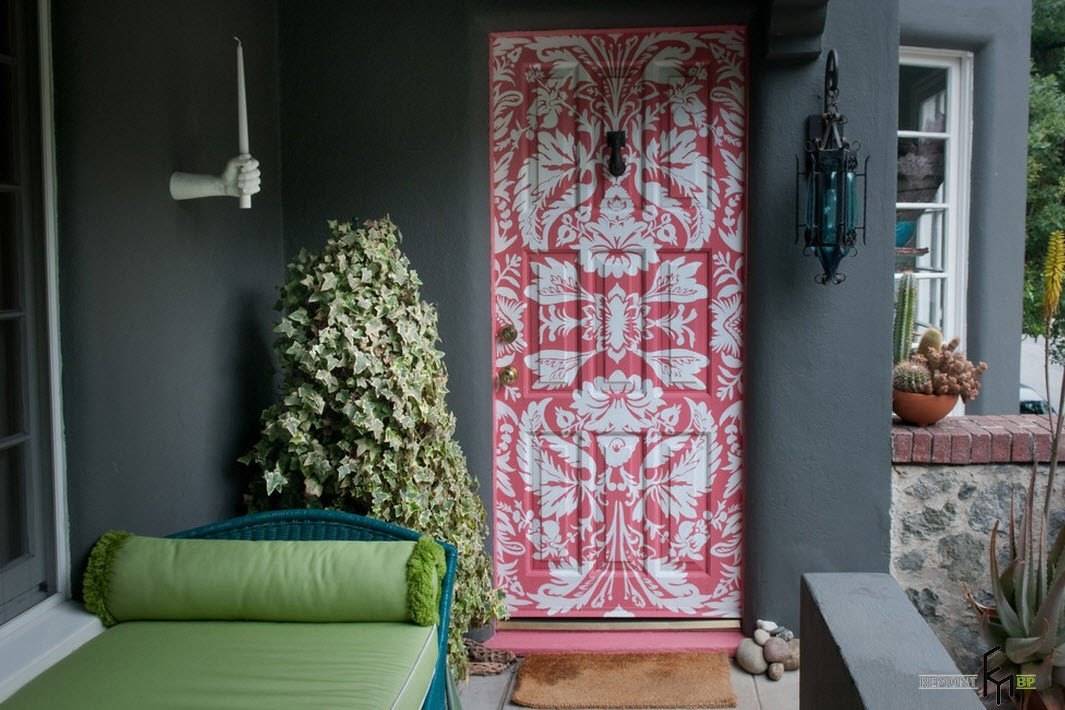 Иначе как эклектичным, стиль оформления этого крыльца назвать нельзя. Расписная дверь с оригинальным орнаментом, плетеная софа с мягкой подложкой активной расцветки, необычные настенные светильники – такой главный вход в частное домовладение сложно забыть.