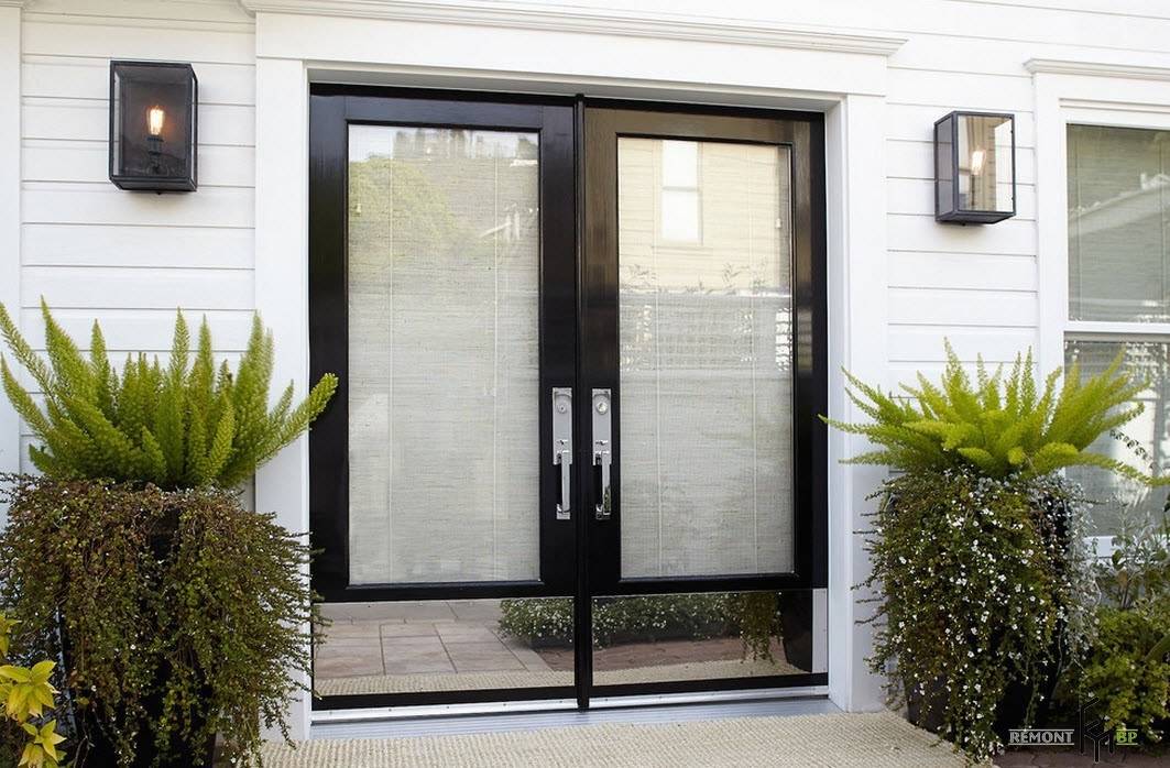Большие двустворчатые двери с черным каркасом, стеклянными и зеркальными вставками, симметричное расположение настенных фонарей и кадок с растениями создали сбалансированный и гармоничный образ главного входа частного домовладения.