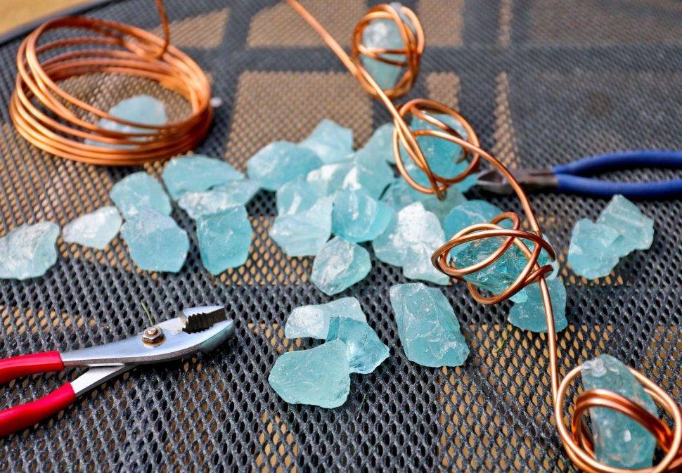 Для изготовления дождевой цепи понадобятся пассатижи и кусачки, кусковое стекло эрклез и мягкая медная проволока.