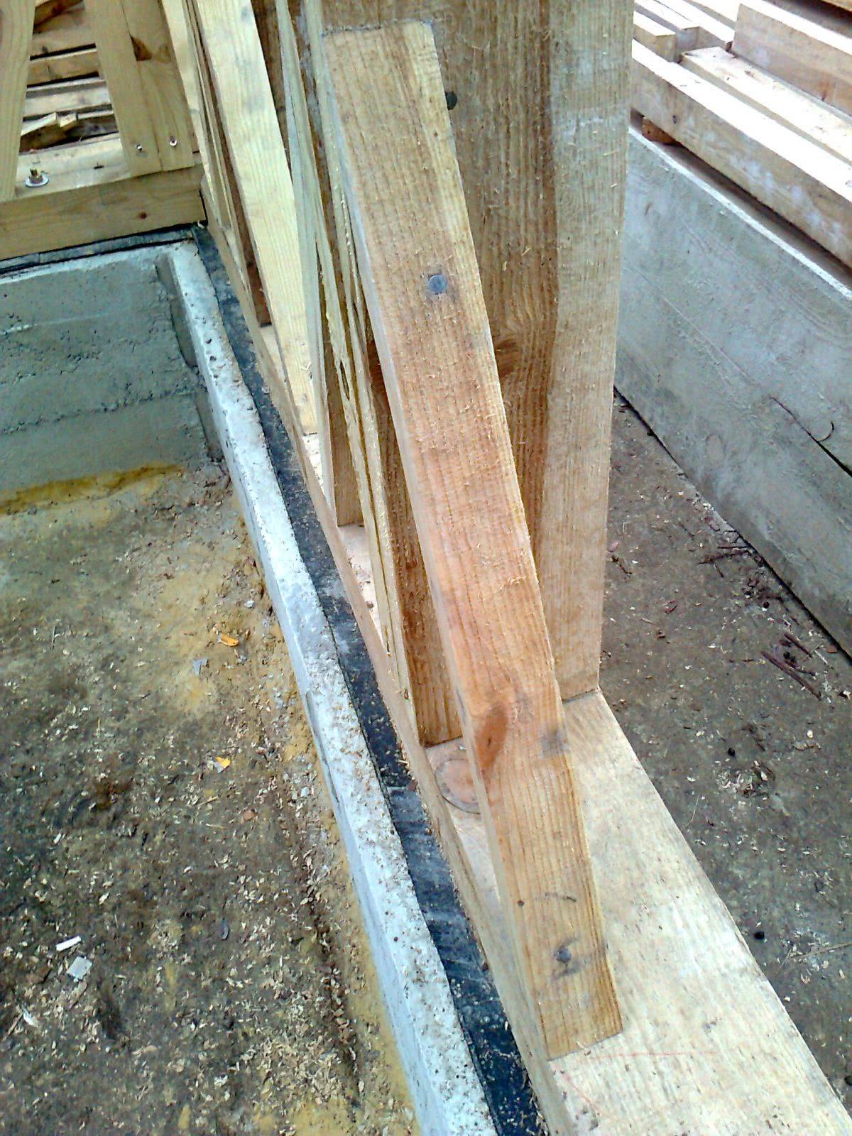 Но крепления стоек только в нижней части недостаточно, до момента установки верхней обвязки жесткость их закрепления будет недостаточной. Поэтому каждая стойка крепится временным укосом. Можно использовать один длинный укос, захватывающий сразу несколько стоек. Без этих укосов стойки могут расшататься в процессе монтажа каркаса.