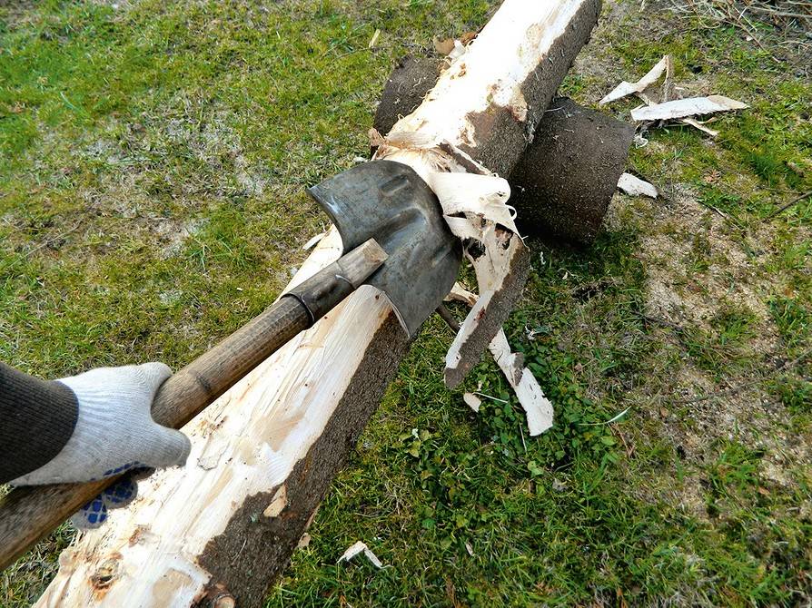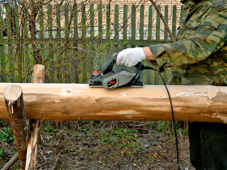 Свежеспиленные брёвна очищают от коры с помощью специальной, хорошо заточенной лопаты или плотницкого топора. В обоих случаях заболонь повреждается незначительно, и лесоматериал сохраняет сравнительно высокую стойкость к поражению грибком. Однако на брёвнах остаются остатки луба и неровности на месте сучков, поэтому стены выглядят несколько неаккуратно. Если вы решили оставить сруб без обшивки, имеет смысл доплатить за очистку кругляка скобелем (от 90 руб. за 1 пог. м ) или его остругивание электрорубанком (от 170 руб. за 1 пог. м). При остругивании можно получить результат, внешне близкий к обработке на оцилиндровочной линии, с той лишь разницей, что брёвна будут по-прежнему сужаться от комля.
