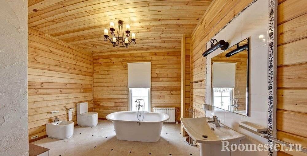 Душевую лучше отделать плиткой, а если она находится в зоне парной, изолировать ее стеклом. Кафель можно подобрать под дерево, чтобы он слился с основным интерьером.
