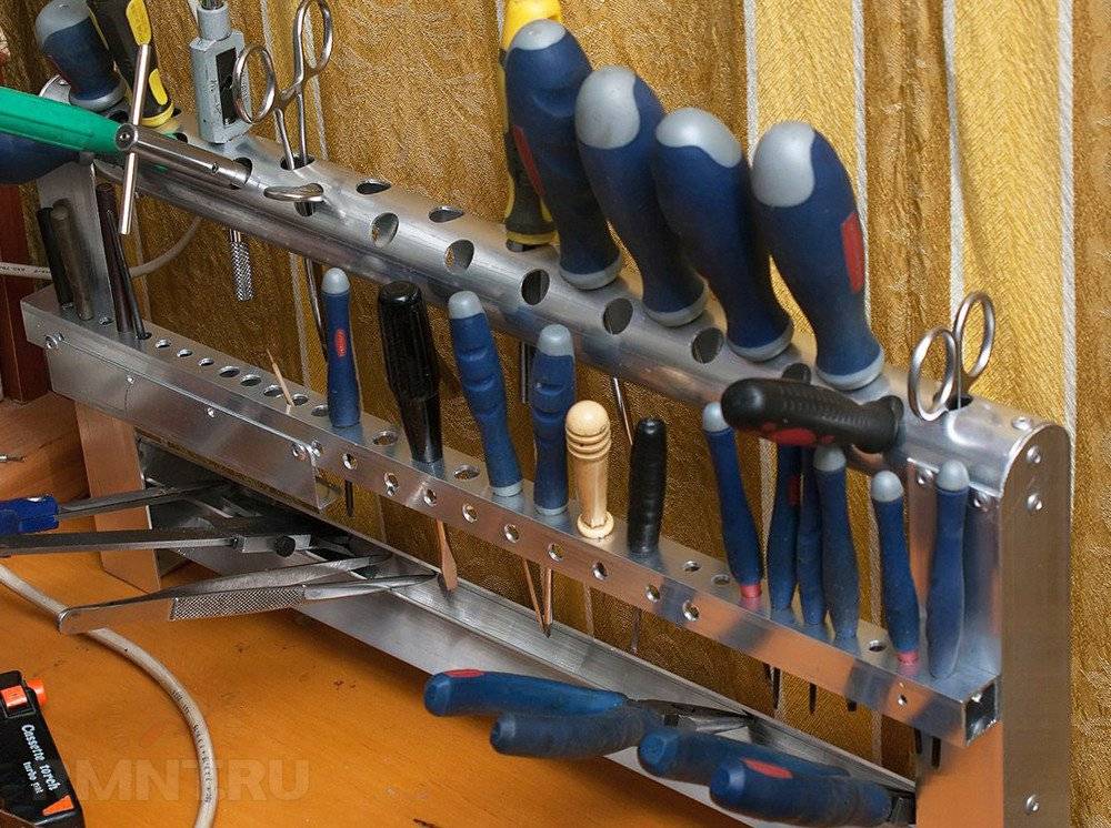 В первую очередь следует решить, будете ли вы покупать готовые полки для инструментов, металлическую передвижную тумбу с ящиками, или обустроите мастерскую своими руками «с нуля». Сразу отметим, что готовые системы хранения для ручного инструмента не всегда подходят на 100%, зачастую их приходится переделывать под себя.