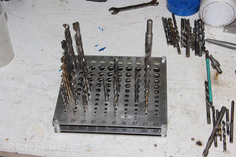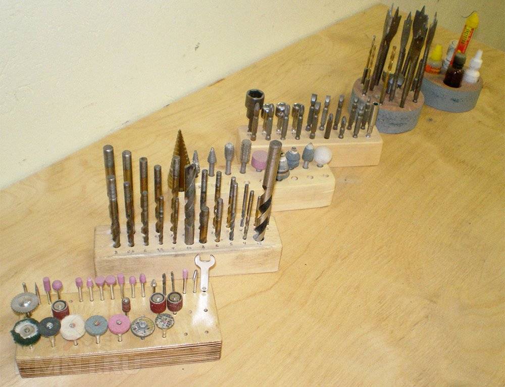 8. Для свёрл и насадок определённого размера лучше купить готовый ложемент — вкладыш с инструментами. Или высверлить отверстия в деревянном брусе, куда встанут свёрла. И подписать — 3, 4,5, 9 и так далее, чтобы сразу знать нужный размер режущего инструмента.