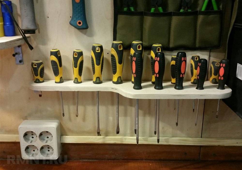 3. Щит из фанеры — выбор мастеров старой школы. Из отрезков брусков на таком щите можно создать целую систему хранения, которая не будет занимать много места и позволит расположить практически весь ручной инструмент. Затраты на такие места хранения минимальны, а сделано всё будет под потребности мастера.