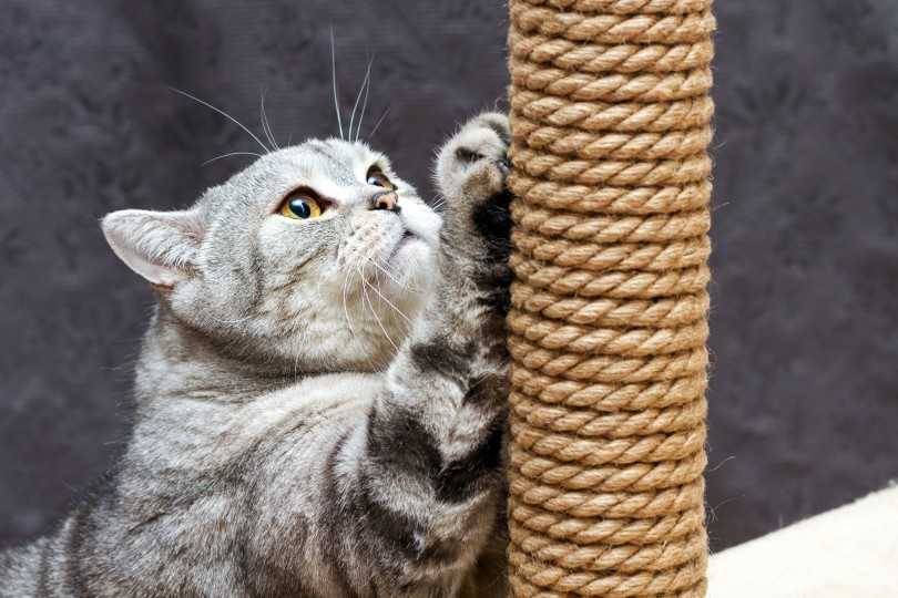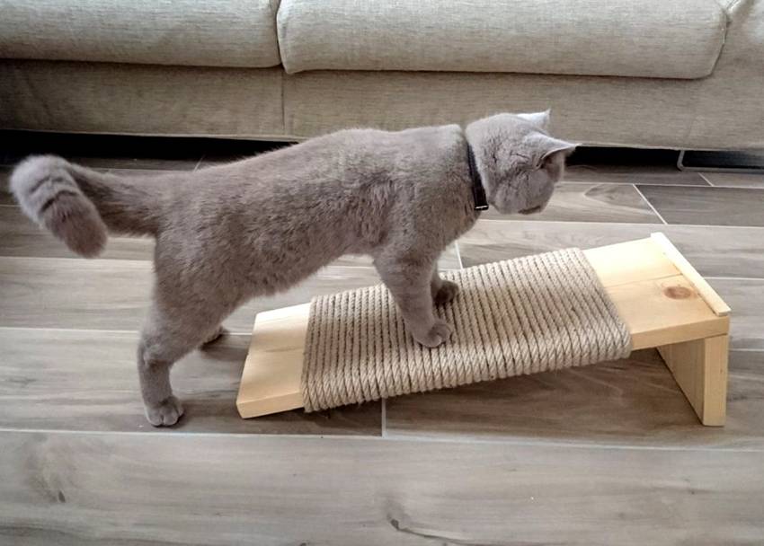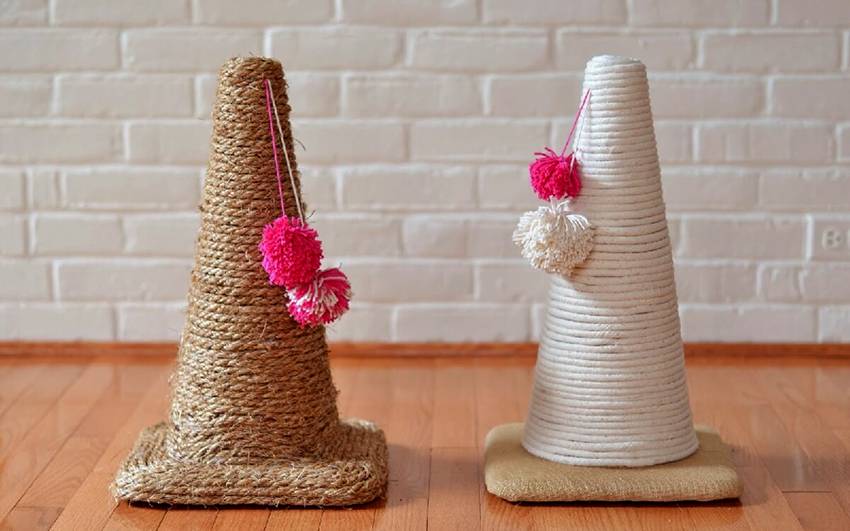Чтобы получить когтеточку, достаточно на основу намотать толстую веревку из натурального материала, такого как пенька, например. Если комплекс не из дерева, то его придется обмотать веревкой полностью, поэтому ее уйдет достаточно много.