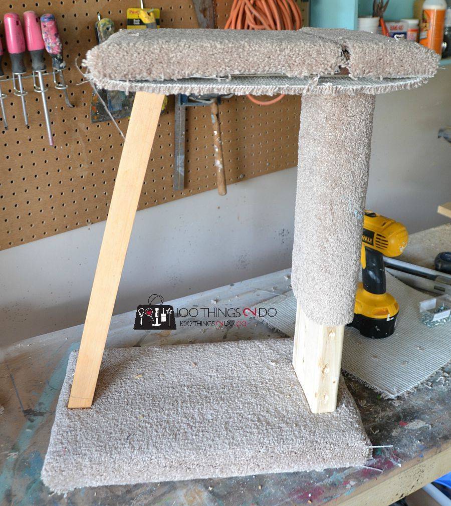 Для когтеточки обмотать стойку можно тем же ковром, а можно использовать сизалевый шнурок, аналогично предыдущим вариантам.