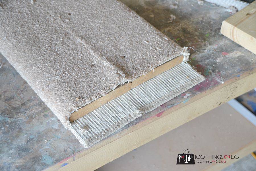 Заворачиваем вокруг наших будущих платформ ковер. Фиксируем его винтами (можно использовать степлер и скобы). Обрезаем излишки ковра.