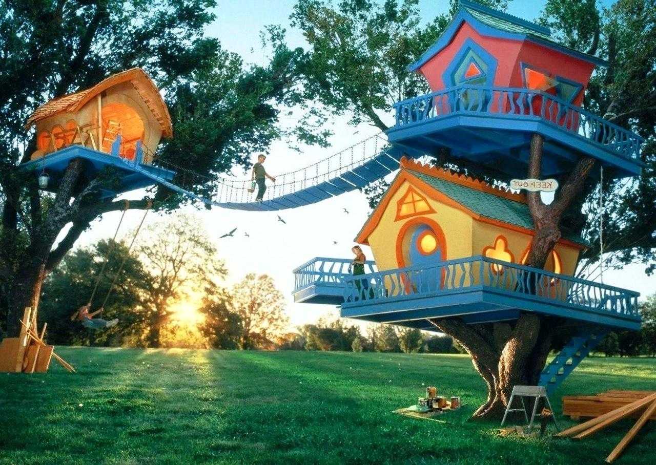 Такому проекту обрадуется каждый ребенок, даже взрослые будут с восторгом участвовать в детских играх. Логичное связующее звено в этой категории – одно раскидистое старое или несколько расположенных рядом деревьев, на которые «наращивают» домик с минимальным ущербом для природы. Игровая площадка может быть закрытой, то есть имеющей полноценную кровлю (а в некоторых случаях и стены), либо открытой, оснащенной высокими перилами.