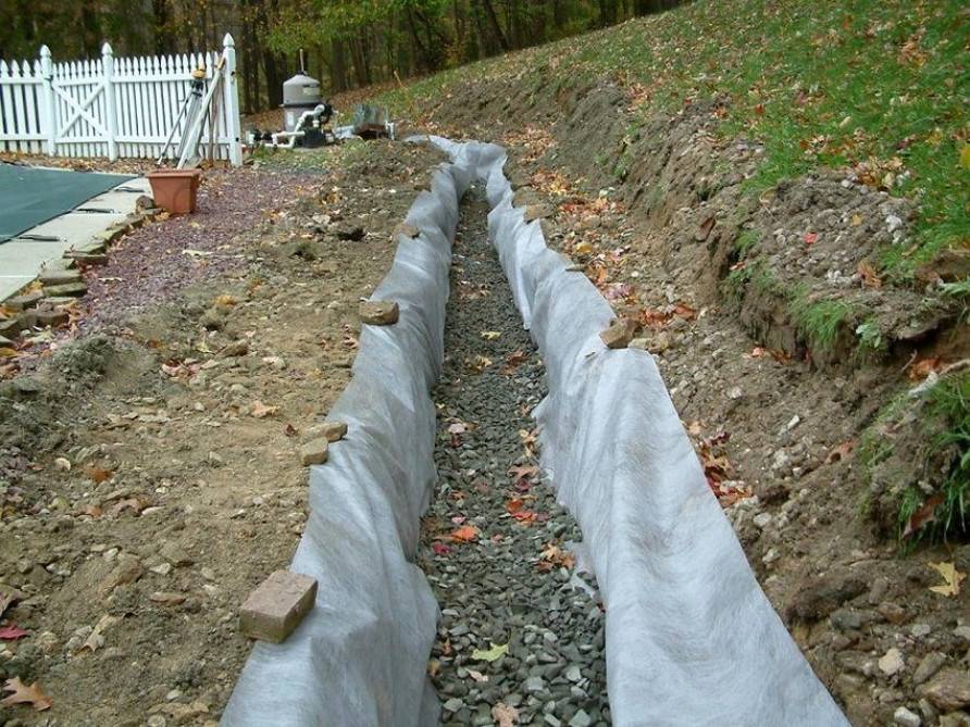 На участке нужно определить самую высокую и самую низкую точки, сделать разметку будущих канавок и выкопать траншеи. Затем застелить их геотекстилём и засыпать щебнем