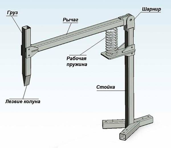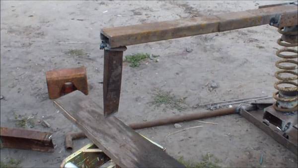 Один из швеллеров используется в качестве основания. К нему же приваривается и второй, но уже перпендикулярно по отношению к первому. Далее необходимо подготовит площадку для монтажа пружины. К основанию приваривается труба и распорки, в качестве которых используются уголки. Далее необходимо на балке сделать небольшой вырез, при помощи которого можно будет прикрепить элемент к основанию. Далее балка приваривается и навешивается другая, с шарнирным узлом. После этого следует установка пружины и фиксация ножа на подвижной трубе. Утяжелитель фиксируется при помощи сварки сверху валуна. После этого можно считать, что конструкция готова. Желательно ее покрасить, чтобы избежать ржавчины.