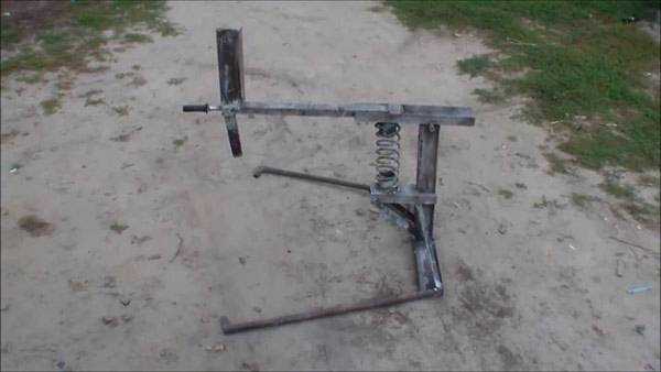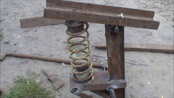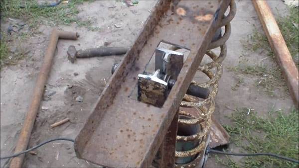Во втулку устанавливают вал. К нему приваривают коромысло (используется швеллер). На нижней части коромысла монтируют небольшой фрагмент трубы. В нем будет фиксироваться верхняя часть пружины.