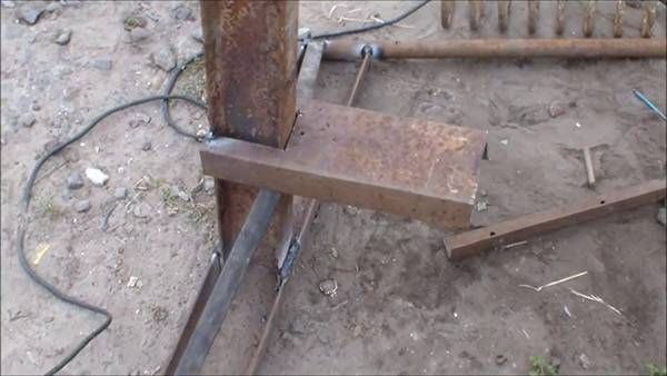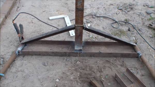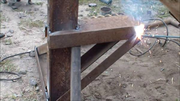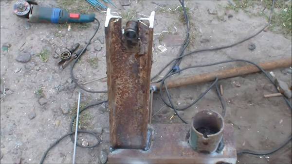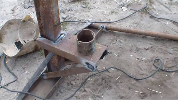 В верхней части стойки выполняется прорезь. В нее устанавливают втулку. Затем ее проваривают. При монтаже нужно выдержать перпендикулярность к стойке. Ось втулки должна быть параллельной земле. Для сварки используют кондуктор, который позволит выполнить указанные условия.